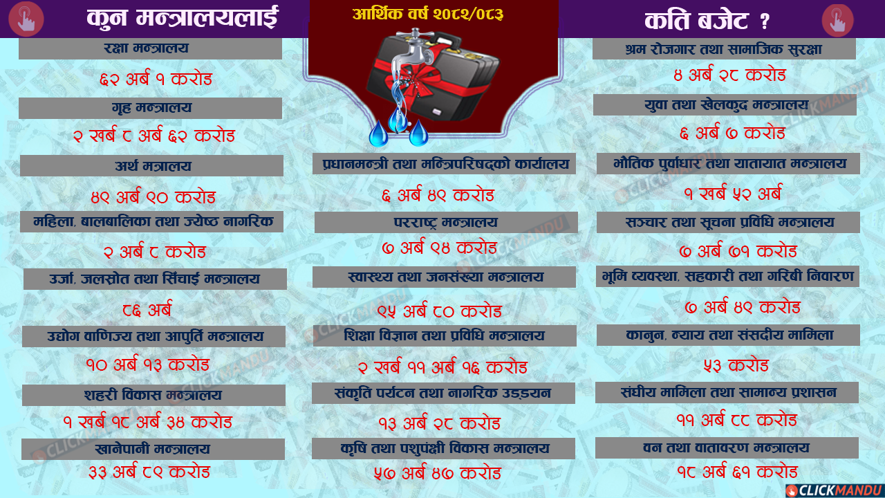 पौडेलले सबैभन्दा बढी गृह मन्त्रालयलाई बजेट विनियोजन गरेका छन् । गृहलाई २ खर्ब ८ अर्ब ६२ करोड रुपैयाँ विनियोजन हुँदा सबैभन्दा कम कानुन मन्त्रालयलाई ५३ करोड विनियोजन गरेका छन् ।
