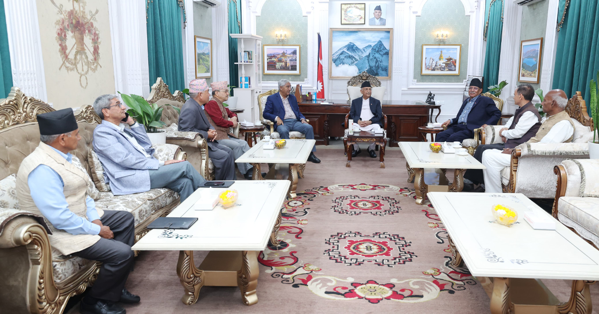प्रधानमन्त्रीसमेत रहेका नेकपा एमाले अध्यक्ष केपी शर्मा ओली, नेपाली कांग्रेसका सभापति शेरबहादुर देउवा, माओवादी केन्द्रका अध्यक्ष पुष्पकमल दाहाल ‘प्रचण्ड’, महासचिव देव गुरूङ, प्रमुख सचेतक हितराज पाण्डे सहितको बैठक सिंहदरबारमा बसिरहेको हो ।