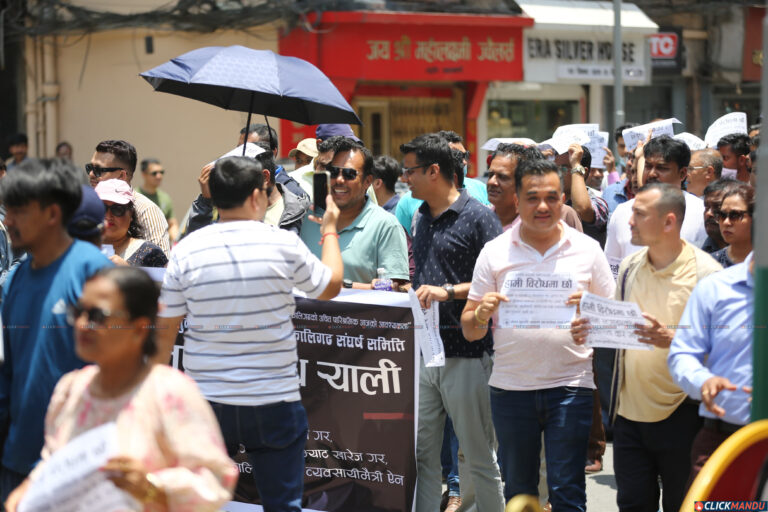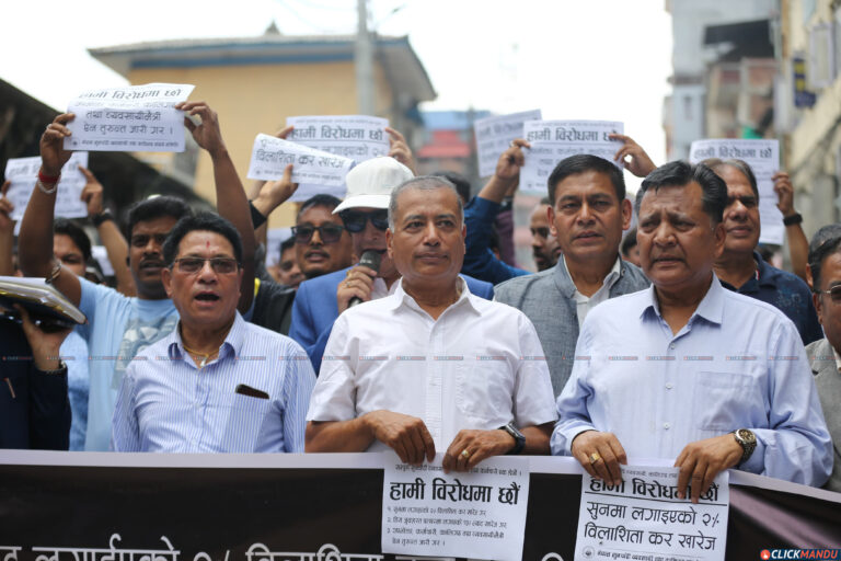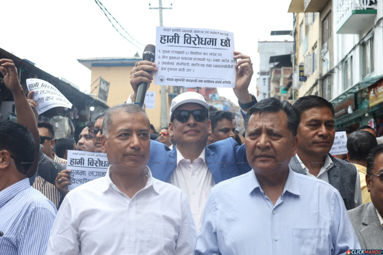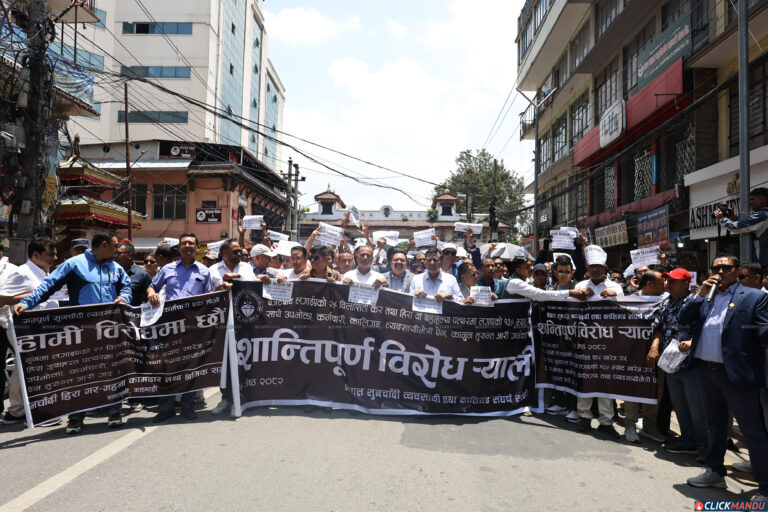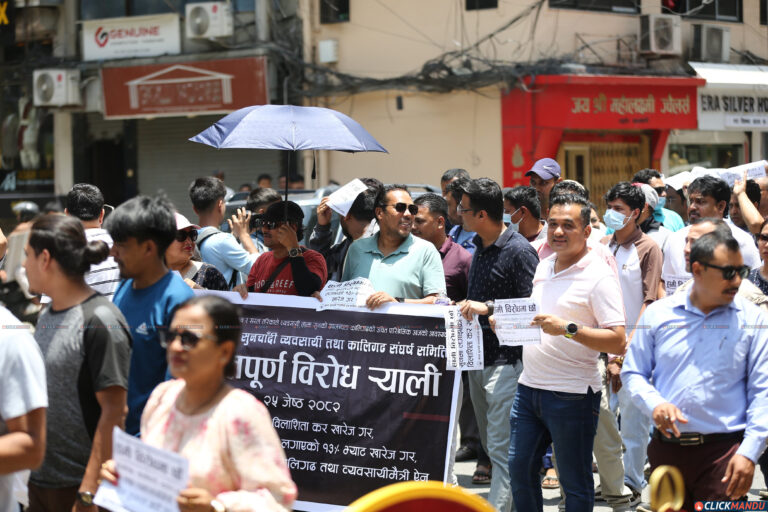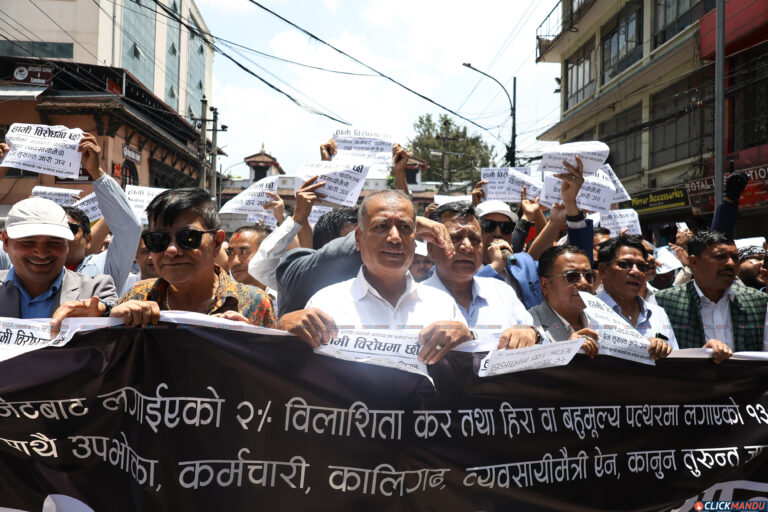 आर्थिक वर्ष २०८२/८३ को बजेटमार्फत सरकारले सुन र चाँदीमा २ प्रतिशत विलासिता कर र हिरा, जडित गहना तथा बहुमूल्य पत्थरमा १३ प्रतिशत कर लगाउने घोषणा गरेको भन्दै त्यसको विरोधमा आइतबार व्यवसायीहरूले प्रदर्शन गरेका हुन् ।