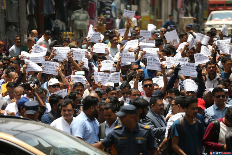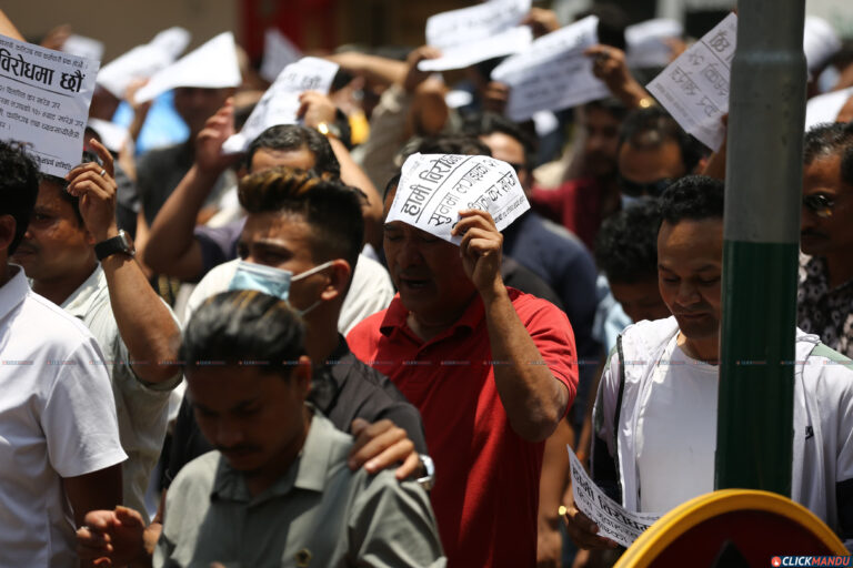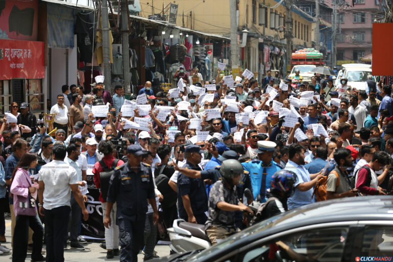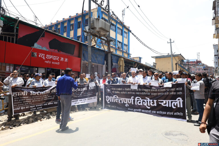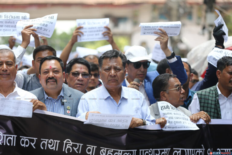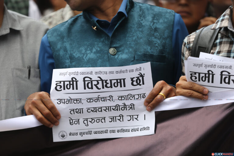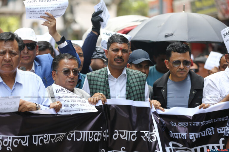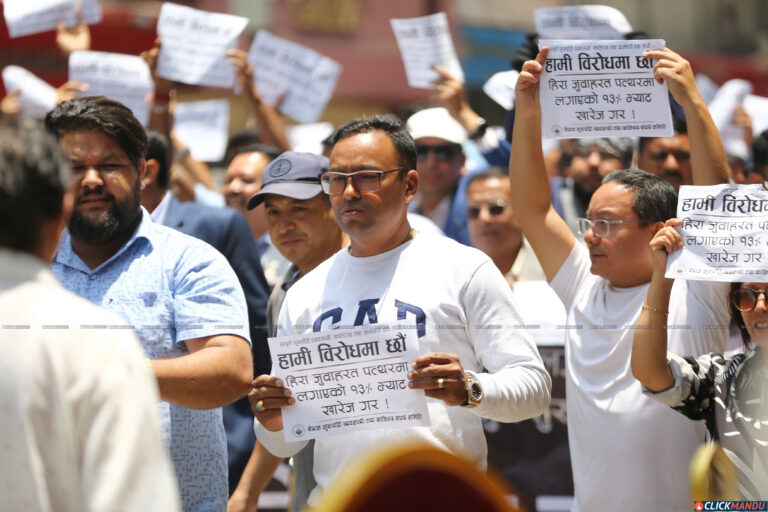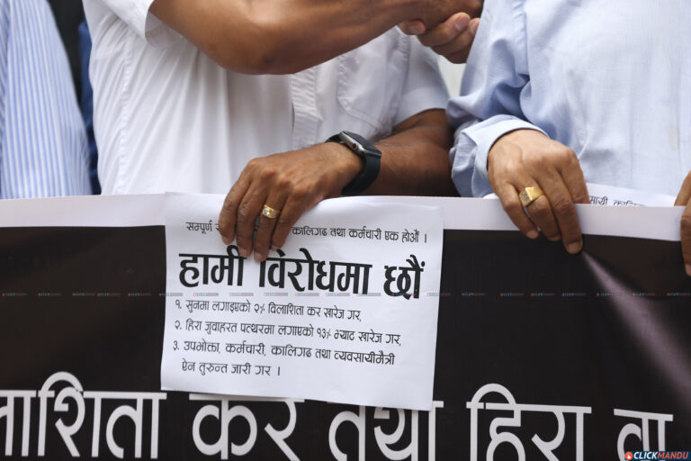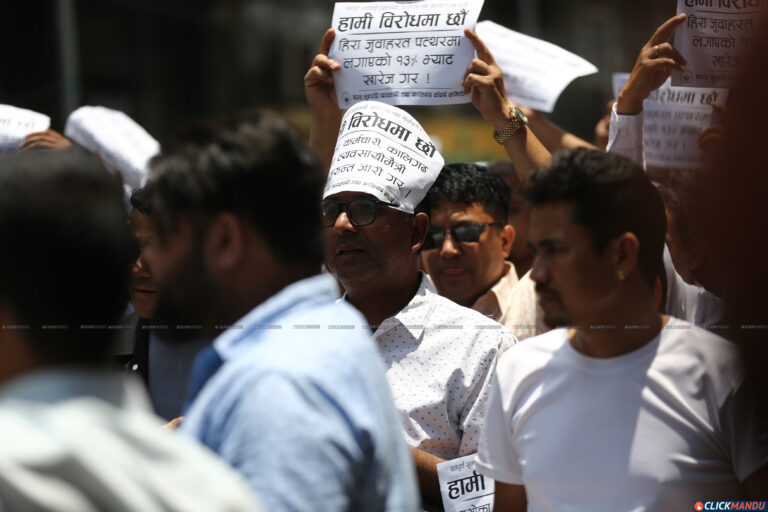 काठमाडौं । सरकारले सुन, चाँदी र हिरामा लगाएको विलासिता करको विरोधमा काठमाडौंमा प्रदर्शन भएको छ ।