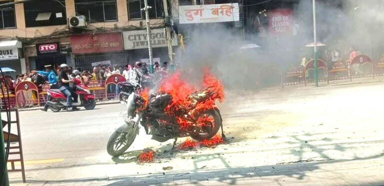 काठमाडौं । काठमाडौंको न्युरोड सडक खण्डमा गुडिरहेको एउटा मोटरसाइकलमा आगलागी भएको छ ।