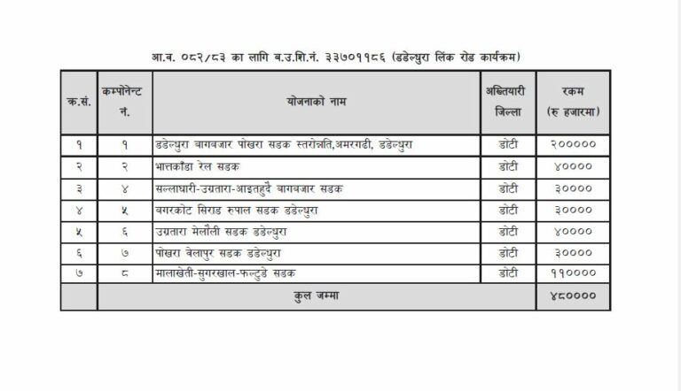 यसैगरी रणनैतिक सडक पुल निर्माण तथा पुल पुलेसा संरक्षण अध्ययन कार्यक्रमतर्फ ३५३ योजनामध्ये १५८ योजनामा ७ करोड ३६ लाख रुपैयाँ बजेट बिनियोजन भएको छ ।