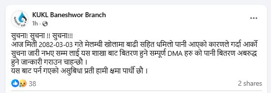 केयुकेएलले मंगलबार मेलम्ची खोलामा बाढी सहित धमिलो पानी आएकाले अर्को सुचना जारी नभएसम्मका लागि पानी बितरण प्रणाली अवरुद्ध हुने जानकारी दिएको छ ।