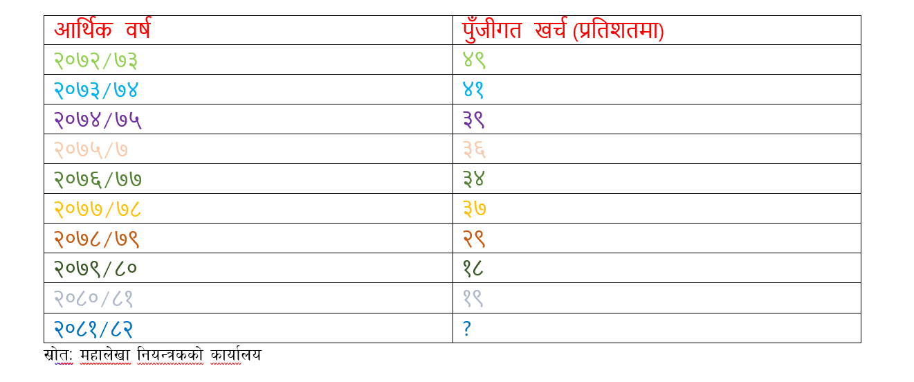 अर्थमन्त्रालय अन्तर्गतको महालेखा नियन्त्रकको २ असारसम्मको तथ्यांक अनुसार चालु आर्थिक वर्षलाई विनियोजना गरेको ३ खर्ब ५२ अर्ब रुपैयाँको पुँजीगत बजेटमध्ये १ खर्ब ४५ अर्ब रुपैयाँ मात्रै खर्च भएको छ । यही तथ्यांकअनुसार सरकालाई अबको २२ दिनमा २ खर्ब खर्च गर्नुपर्दा दैनिक ९ अर्ब ३९ करोड रुपैयाँको खोलो नै बगाउनुपर्ने हुन्छ ।