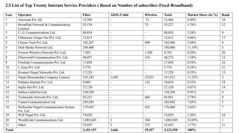 तथ्यांक अनुसार हालसम्ममा १० लाख ३ हजारलाईलाई सेवा दिएर वल्र्डलिंक पहिलो नम्बरमा छ भने ३ लाख ५१ हजार सेवा दिने नेपाल टेलिकम दोस्रो सूचीमा रहेको छ ।