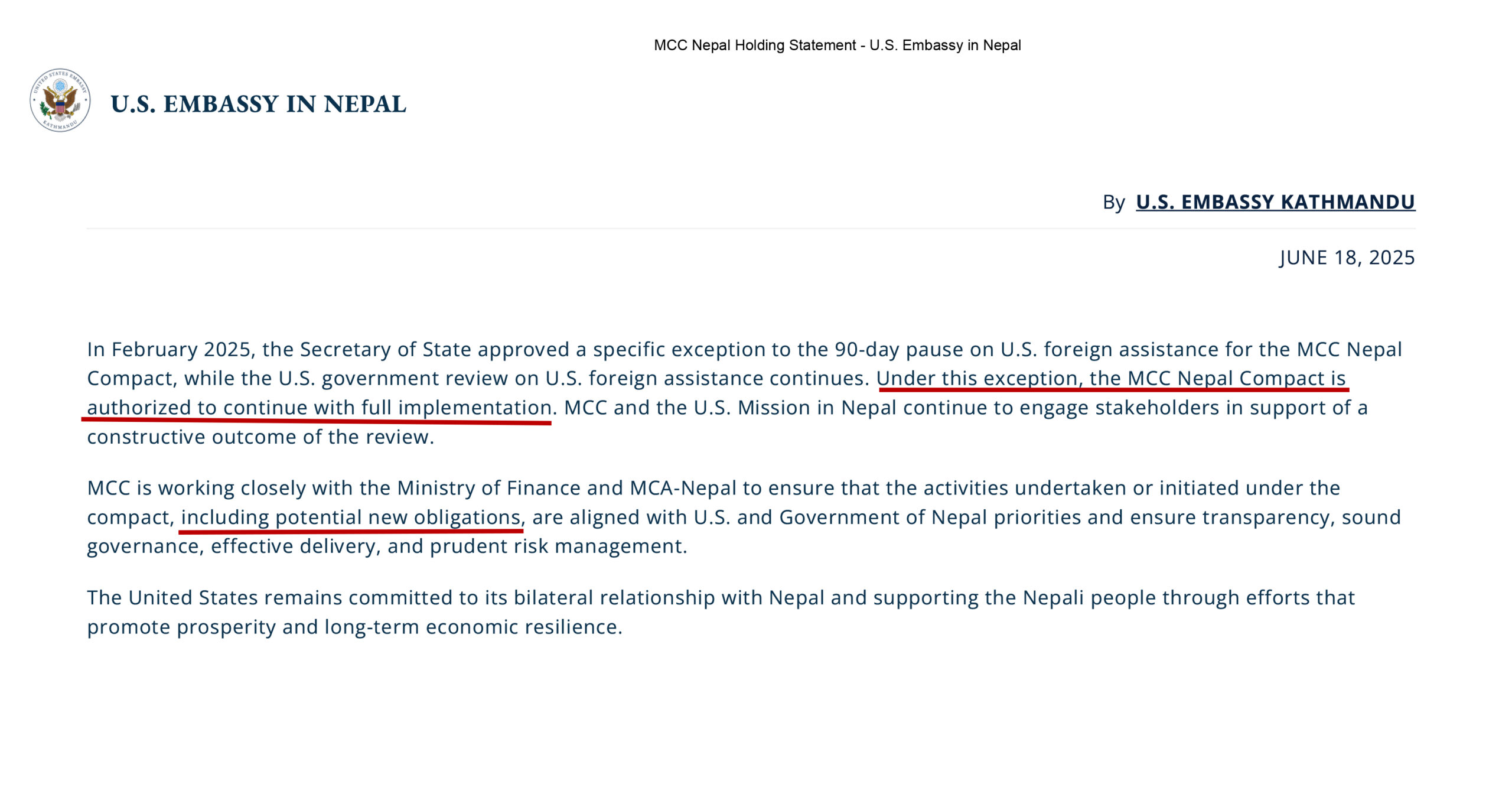 बुधबार अमेरिकी राजदूतावासले जारी गरेको विज्ञप्तिमा फेब्रुअरी २०२५ मा अमेरिकी विदेशमन्त्रीले वैदेशिक सहायता सम्बन्धी समिक्षा चलिरहेकै बेला लागु गरिएको ९०–दिने रोकमा एमसिसी नेपाल कम्प्याक्टका लागि विशेष अपवाद प्रदान गर्दै एमसिसिको निरन्तर कार्यान्वयनलाई स्वीकृति दिएको उल्लेख छ । सो अपवादले एमसिसी नेपाल कम्प्याक्टको कार्यान्वयनलाई समिक्षा अवधिमा पनि निरन्तर अगाडि बढाउन स्वीकृत प्रदान गरेको दुतावासको दाबी छ ।