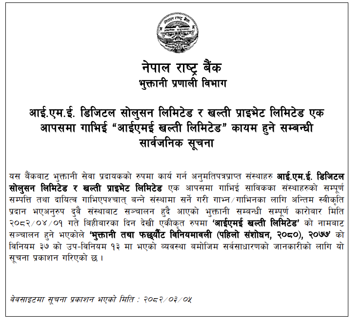 नेपाल राष्ट्र बैंकबाट भुक्तानी सेवा प्रदायकको रुपमा कार्य गर्न अनुमतिपत्रप्राप्त संस्थाहरु आईएमई डिजिटल सोलुसन र खल्ती प्राइभेट लिमिटेड एक आपसमा मर्ज भएका हुन् ।