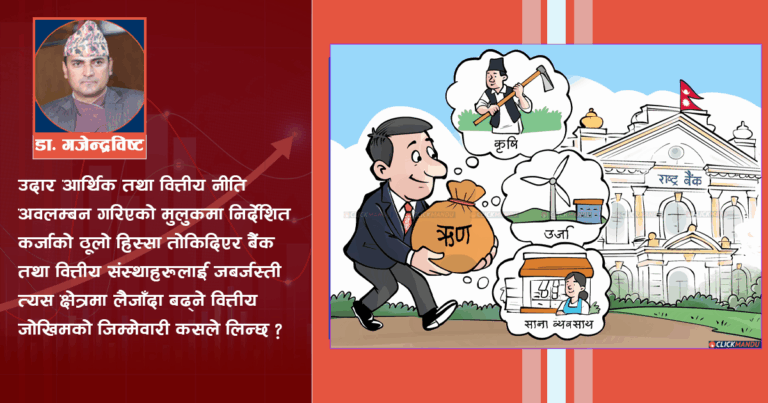 नेपालमा कार्यरत स्ट्याण्डर्ड चार्टर्ड बैंकले गत असारसम्म निर्देशित कर्जासम्बन्धी केन्द्रीय बैंकले गरेको नीतिगत व्यवस्थाको अनुपालना नगरेका कारण झण्डै १५ करोड रुपैयाँ बराबरको जरिवाना स्वीकार्नुपर्यो । निर्देशित कर्जाको अनुपालना गर्दा हुने जोखिमभन्दा १५ करोड रुपैयाँ बराबरको जरिवाना स्वीकार्नु उसका लागि सस्तो परेको विश्लेषण गरिएको छ । यस बैंकले पहिला पनि सरकारले तोकेका कतिपय प्राथमिकताका क्षेत्रमा कर्जा … Continue reading निर्देशित कर्जाले कहाँ पुर्याउला ?