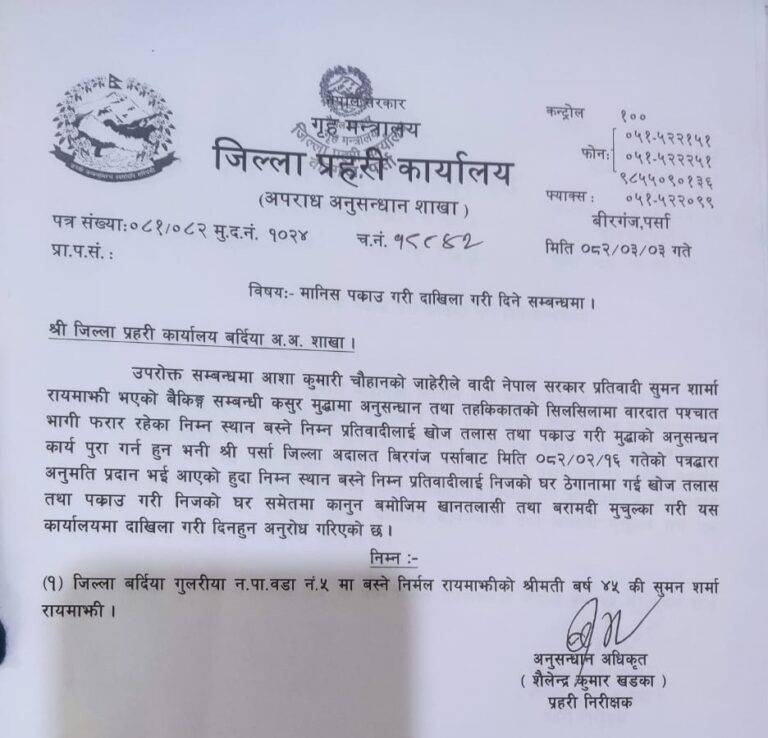 काठमाडौं । जनमत पार्टीकी लुम्बिनी प्रदेशसभा सदस्य सुमन शर्मा रायमाझीविरुद्ध जिल्ला अदालत पर्साबाट बैंकिङ कसुरसम्बन्धी अभियोगमा पक्राउ पुर्जी जारी भएको छ। जेठ १६ गते जारी पुर्जीपछि उनी फरार रहेको प्रहरीले जनाएको छ।