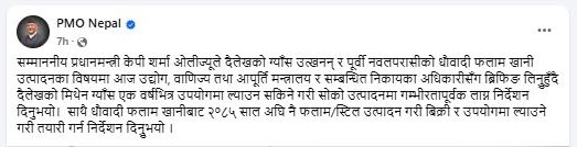 प्रधानमन्त्री ओलीले एक वर्षभित्र उक्त ग्यास उपयोगमा ल्याएर परीक्षण उत्पादन गर्नका लागि आवश्यक पर्ने बजेट र सहजीकरणमा सरकारबाट कमी नहुने बचन पनि दिएका छन् ।