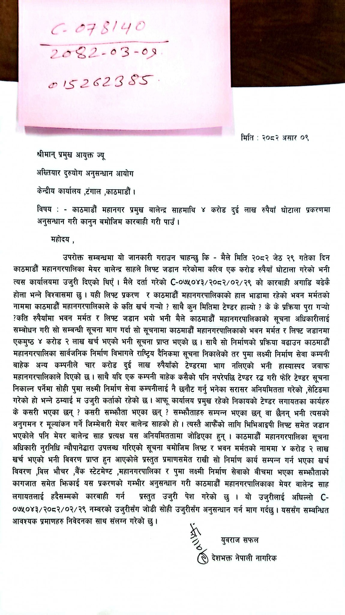 अधिवक्ता युवराज सफलले महानगरको भवन मर्मत र लिफ्ट जडानमा बालेनले अनियमितता गरेको भन्दै अख्तियारमा उजुरी दिएका छन् । यसअघि सफलले नै लिफ्ट जडानमा १ करोड रुपैयाँ बढीको भ्रष्टाचार भएको उजुरी दिएका थिए । तर उनले फेरि रकम थप गरेर अर्को उजुरी दिएका हुन् ।