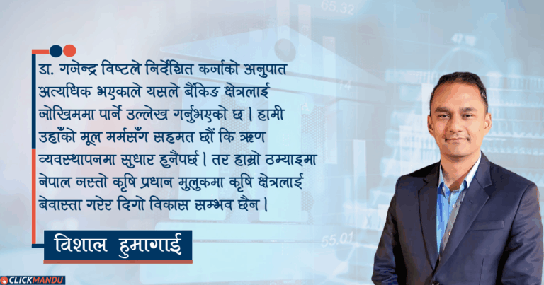 (हुमागाईं राष्ट्रिय कृषि कम्पनी नेपालका कार्यकारी अध्यक्ष हुन् । हुमागाईंको प्रस्तुत लेख क्लिकमान्डुको विशेष प्रकाशन मौद्रिक सुशासनमा प्रकाशित डा. गजेन्द्र विष्टको लेख निर्देशित कर्जाले कहाँ पुर्याउला ? ले समेटको विषयमा फरक मतस्वरूप क्लिकमान्डुलाई प्राप्त भएको हो ।)