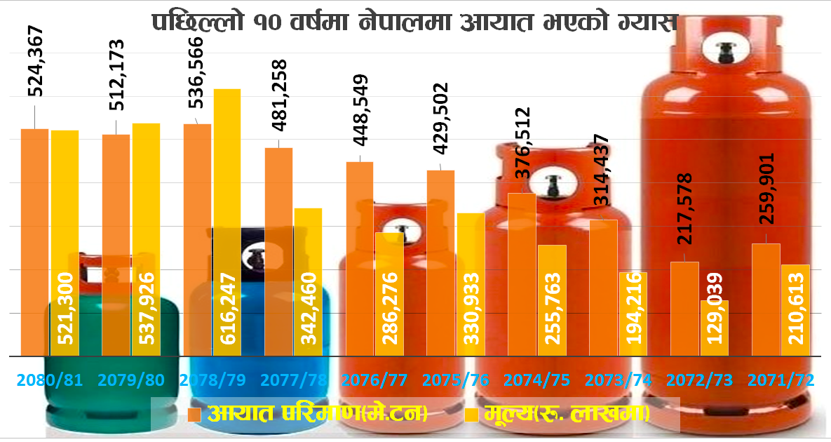 नेपाल आयल निगमका प्रवक्ता मनोज ठाकुरका अनुसार नेपालमा वार्षिक ५३ अर्बदेखि ६० अर्ब रुपैयाँबराबरको ५ लाख ४० हजार मेट्रिक टनसम्म ग्यास आयात हुँदै आएको छ । राज्यले ग्यास चुल्होको स्थानमा बिजुली चुल्हो प्रयोग गर्ने नीति लिएपनि त्यसअनुसार गृहकार्य नहुँदा नेपाल आयल निगमले ग्यासबाट मात्रै वार्षिक १० अर्ब रुपैयाँबराबरको घाटा व्यहोर्दैआएको छ ।