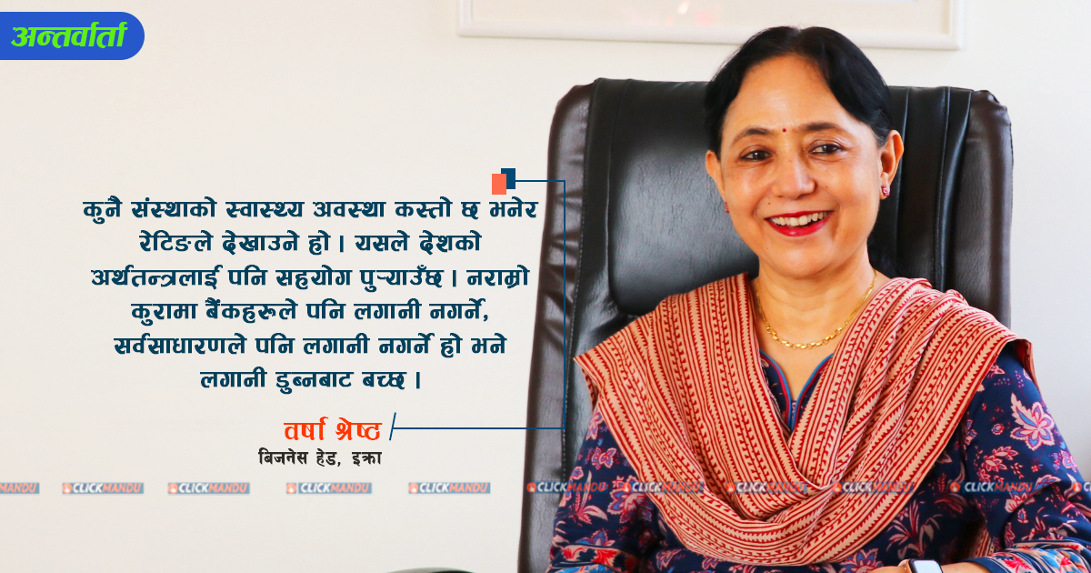 नेपाल राष्ट्र बैंकले ५० करोड रुपैयाँभन्दा माथिको कर्जामा अनिवार्य रुपमा क्रेडिट रेटिङ गनुपर्ने व्यवस्था गरेको छ । सोही रेटिङका आधारमा मात्रै बैंकहरुले कर्जा लगानी गर्नुपर्ने व्यवस्था छ । पछिल्लो समय अर्थतन्त्रमा देखिएको सुस्ततासँगै निजी क्षेत्रको व्यापार व्यवसाय प्रभावित भएको अवस्था छ । सोही कारण व्यवसायिक कारोबार घटेको अवस्था छ । यस्तोमा रेटिङले सपोर्ट गर्ने अवस्था नभएपछि कतिपय व्यवसायिले रेटिङलाई आवश्यक विवरण उपलब्ध नगराउँदा रेटिङ फिर्ता लिने क्रम पनि बढेको छ । सोही परिस्थितिमा क्लिकमान्डुले क्रेडिट रेटिङ कम्पनी इक्रा नेपालका बिजनेस हेड वर्षा श्रेष्ठसँग कर्जामा रेटिङको अवश्यकता, रेटिङले देखाएको निजी क्षेत्रको अवस्था लगायतका विषयमा केन्द्रित रहेर क्लिकमान्डुका रोविन पौडेलले गरेको कुराकानी-