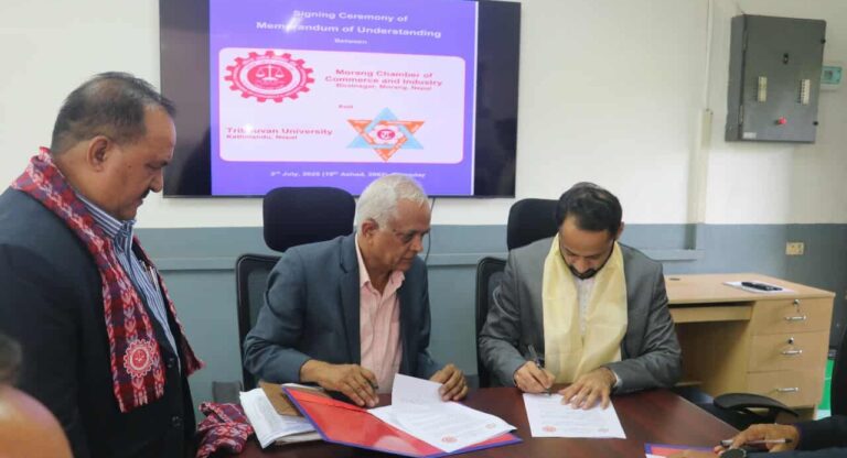 विराटनगर । मोरङ उद्योग व्यापार संघ र त्रिभुवन विश्वविद्यालयबीच विद्यार्थीलाई व्यावहारिक ज्ञान, प्रत्यक्ष अनुभव तथा अनुसन्धानमा सहयोग पुर्याउने र उद्योग व्यवसाय क्षेत्रमा सीपमा आधारित रोजगारी (प्लेसमेन्ट) उपलब्ध गराउने विषयमा पाँच वर्षीय द्विपक्षीय समझदारी भएको छ ।