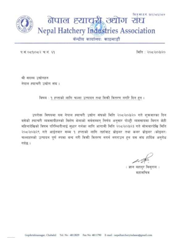 संघको शुक्रबार बसेको बिशेष भेलाले सोमबार ( असार २३ गते) देखि आगामी आइतबार(असार २९ गते) सम्म एक साताका लागि संघमा आवद्ध उद्योगीलाई ब्रोइलर र कलर ब्रोइलर(कोइलर) कुखुराको चल्लाको उत्पादनमा पूर्ण रुपमा रोक लगाउने निर्णय गरेको हो ।