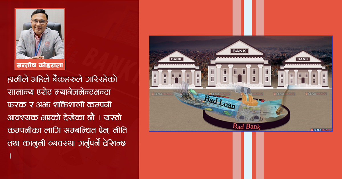 तर, यस्ता काम गर्दै जाँदा पनि बैंकहरुले मात्र समाधान गर्न सक्नेभन्दा बाहिरका समस्या आइपर्ने अवस्था आउँछ । त्यसरी ठूला समस्या समाधान गर्नका लागि एसेट म्यानेजमेन्ट कम्पनीको आवश्यकता पर्छ भन्ने हाम्रो धारणा हो । अन्तर्राष्ट्रिय अभ्यासमा पनि यस्तो किसिमको संयन्त्रको व्यवस्था गरिएको पाइन्छ ।