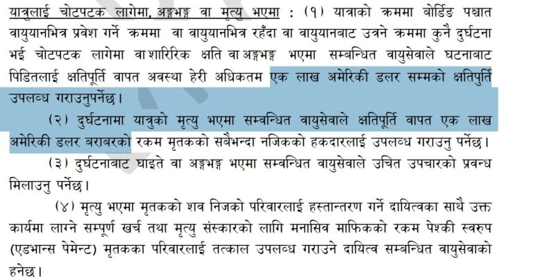 उक्त मस्यौदामा आन्तरिक वायुसेवाका यात्रुको दुर्घटनामा ज्यान गुमाएमा सम्बन्धित वायुसेवा कम्पनीले बीमा कम्पनीमार्फत यात्रुलाई एक लाख अमेरिकी डलर अर्थात हालको डलर सटहीको मूल्यअनुसार सवा करोड रुपैयाँभन्दा बढी रकम भुक्तानी गर्नुपर्छ । हालको व्यवस्था हवाई दुर्घटनामा मृत्यु भएका यात्रुका परिवारले २० हजार डलर पाउँने व्यवस्था छ । यसलाई सरकारले कानून नै बनाएर ५ गुणा बढाउने प्रस्ताव गरेको छ ।