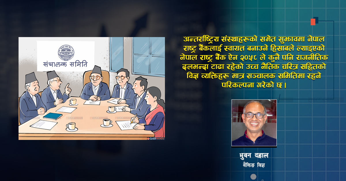 अन्तर्राष्ट्रिय संस्थाहरूको समेत सुझावमा नेपाल राष्ट्र बैंकलाई स्वायत्त बनाउने हिसाबले ल्याइएको नेपाल राष्ट्र बैंक ऐन २०५८ ले कुनै पनि राजनीतिक दलभन्दा टाढा रहेको उच्च नैतिक चरित्र सहितको विज्ञ व्यक्तिहरू मात्र सञ्चालक समितिमा रहने परिकल्पना गरेको देखिन्छ ।