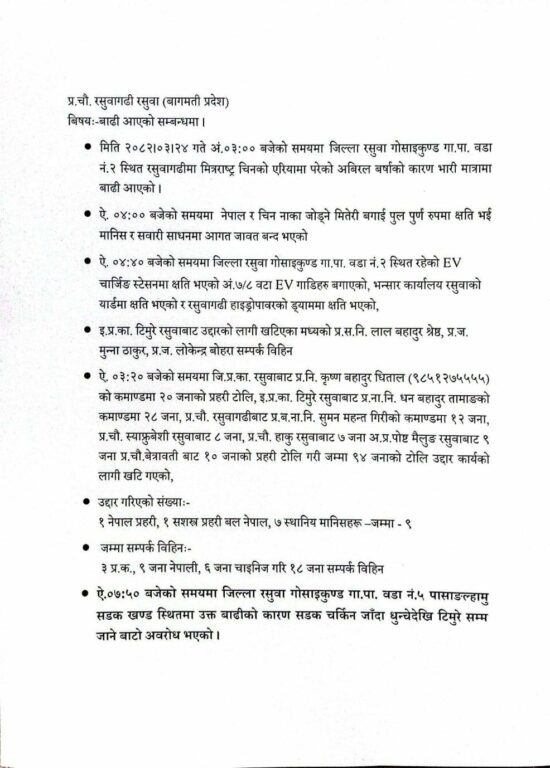 थापाका अनुसार ईलाका प्रहरी कार्यालय टिमुरे रसुवाबाट उद्धारको लागि खटिएका प्रहरीमध्ये प्रहरी सहायक निरिक्षक लालबहादुर श्रेष्ठ, प्रहरी जवान मुन्ना ठाकुर र लोकेन्द्र बोहरा सम्पर्क बिहिन भएका छन् ।