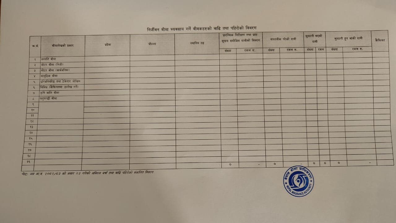 जसअनुसार सम्पत्ति बिमा, मोटर बिमा, सामुद्रिक बिमा, इन्जिनियरिङ तथा ठेकेदार बिमा, कृषि बालि बिमा, पशुपन्छी बिमा आदीको विवरण प्राधिकरणले तोकेको फर्म्याटमा उपलब्ध गराउन भनिएको छ ।