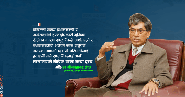 पछिल्लो चरणमा ‘यो क्षेत्र राष्ट्र बैंकको हो’ भनेर छोड्ने भन्दा पनि ‘व्यवसायीको यो माग हामी पुरा गछौं’ भनेर प्रधानमन्त्री र अर्थतन्त्रीले हस्तक्षेपकारी भुमिका खेलेका कारण राष्ट्र बैंकले अर्थमन्त्री र प्रधानमन्त्रीले भनेको काम गर्नुपर्ने अवस्था आएको छ । यो परिपाटीलाई हटाएनौं भने राष्ट्र बैंकलाई अर्थ मन्त्रालयको मौद्रिक शाखा भन्दा हुन्छ ।