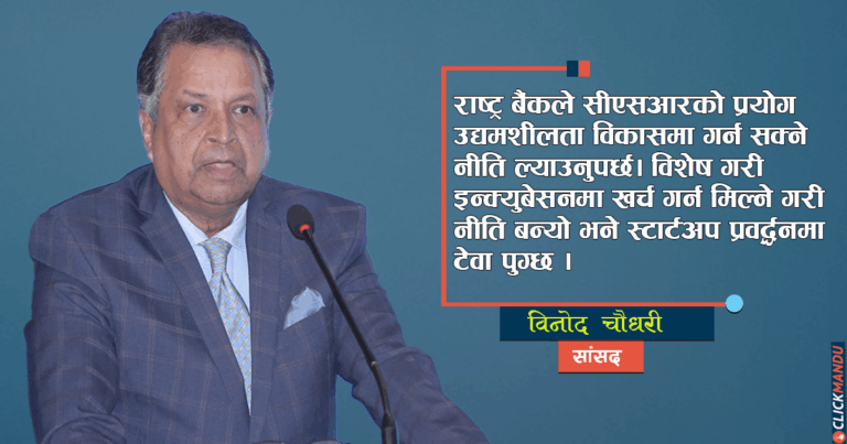 राष्ट्र बैंकले सीएसआरको प्रयोग उद्यमशीलता विकासमा गर्न सक्ने नीति ल्याउनुपर्छ। विशेष गरी इन्क्युबेसनमा खर्च गर्न मिल्ने गरी नीति बन्यो भने स्टार्टअप प्रवर्द्धनमा टेवा पुग्छ।