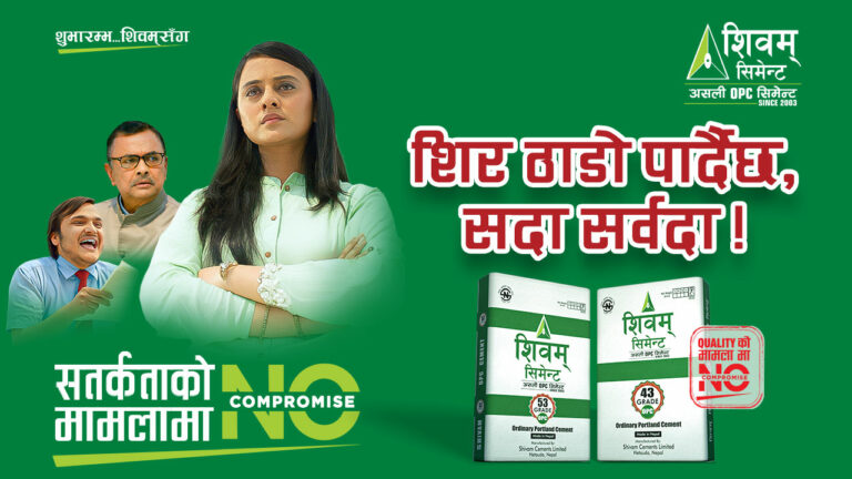 शिवम् सिमेन्टको यो अभियान केवल विज्ञापन मात्र नभएर समाजप्रतिको उत्तरदायित्व र जनचेतना अभिवृद्धिमा केन्द्रित छ । ‘नो कम्प्रोमाइज भन्न जति सजिलो छ त्यति नै व्यवहारमा पुरा गर्न गाह्रो छ, तर जसले पुरा गर्छ, उसको शिर सँधै ठाडो हुन्छ’ भन्ने सन्देश मार्फत, शिवम् सिमेन्टले आफ्नो गुणस्तरमा कहिल्यै सम्झौता नगर्ने नीति झनै मजबुत रूपमा प्रस्तुत गरेको छ ।