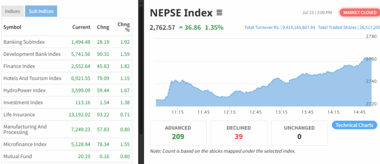 मंगलबार नेप्सेमा कुल २०९ कम्पनीको सेयर मूल्य बढ्दा ३९ कम्पनीको घटेको छ । आज नेप्सेमा सुपर मादी हाइड्रोपावरको सेयर मूल्य सर्वाधिक अर्थात् ८.०८ प्रतिशतले बढेको छ ।