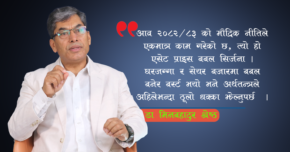 अहिले जुन क्षेत्रमा अधिक लगानी भएर समस्या आएको छ, ती क्षेत्रमा फेरि लगानी हुने जोखिम भयो । अहिले घरजग्गा शिथिल छ । सेयर मार्केटमा पनि राम्रो चलायमान हुन सकेको छैन । त्यसलाई चलायमान गराउने पनि सरकारकोे वित्त नीतिको वा मौद्रिक नीतिको कर्तव्य हो नि भन्नका लागि राष्ट्र बैंकले ल्याएको मौद्रिक नीति एकदमै सही हो । तर एउटा सीमासम्म हुनुपर्नेमा अहिलेको मौद्रिक नीतिले एकमात्र काम ‘एसेट प्राइस बबल’ ल्याउने भयो । घरजग्गा क्षेत्र सेयर मार्केटमा बबल भएर बस्ट भयो भने अर्थतन्त्रले अहिलेभन्दा ठूलो ‘शक’ झेल्नुपर्छ । अहिलेका जति समस्याहरु छन्, त्यसमा थप अर्को समस्या थपिँदा अर्थतन्त्र अझै खराब मोडमा पुग्न सक्छ ।