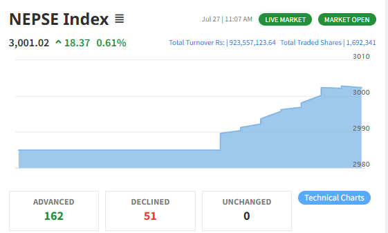 त्यसपछि आइतबार नेप्से पहिलो ३००१ बिन्दुमा उक्लिएको हो ।