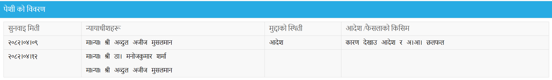 आजको पेशी मुशलमान र मनोजकुमार शर्माको संयुक्त इजलासमा परेको छ ।