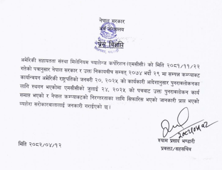 मन्त्रालयले एक विज्ञप्ति जारी गर्दै अमेरिकाबाट एमसीसीले जुलाई २४ मा पुनरावलोकन कार्य समाप्त भएको र नेपाल कम्प्याक्टको निरन्तरताका लागि सिफारिस भएको जानकारीसहितको पत्र पठाएको बताएको हो ।