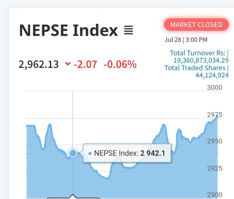 हाल सच्याएपछि भने नेप्से ७.१० अंकले बढेर २९७१.३१ बिन्दुमा रहेको देखाइएको छ । सोमबार नेप्से २ः४५ बजे २९६७.०८ बिन्दुमा, २.५० बजे २९६९.६५ बिन्दुमा, २.५५ बजे २९७२.२७ बिन्दुमा र ३ बजे २९७६.३४ थियो ।