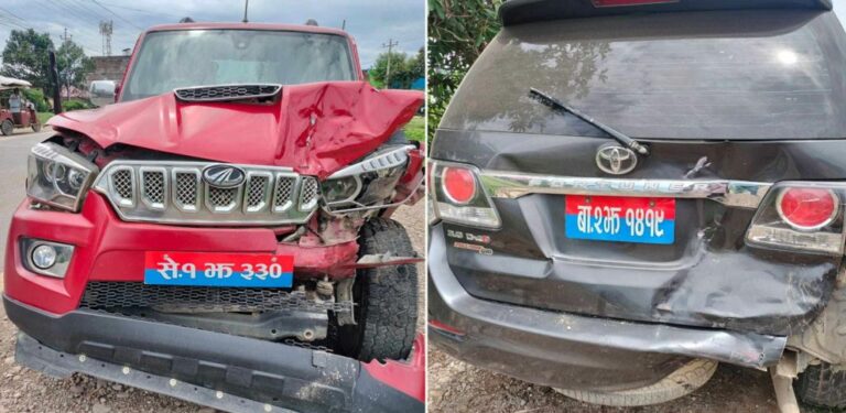 मंगलबार बिहान लम्की क्षेत्रमा सुदूरपश्चिम प्रदेश सरकारका भौतिक पूर्वाधार विकास मन्त्री सुरेन्द्र पाल र आन्तरिक मामिला तथा कानुन मन्त्री हिरा सिंह सार्की सवार गाडीहरू एकआपसमा ठोक्किएका हुन् ।