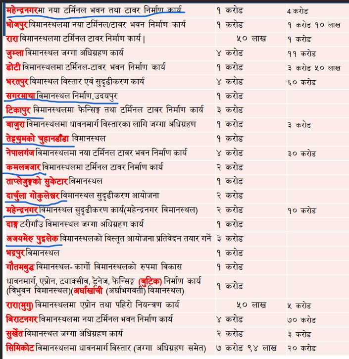 सरकारले प्राधिकरणलाई सञ्चालन भएका र नभएका विमानस्थलमा ५० लाखदेखि ७ करोड रुपैयाँसम्म बजेट दिएको छ । यस्तो रकमलाई प्राधिकरणले १ करोडदेखि ७० करोडसम्म थप लगानी गरेको छ ।