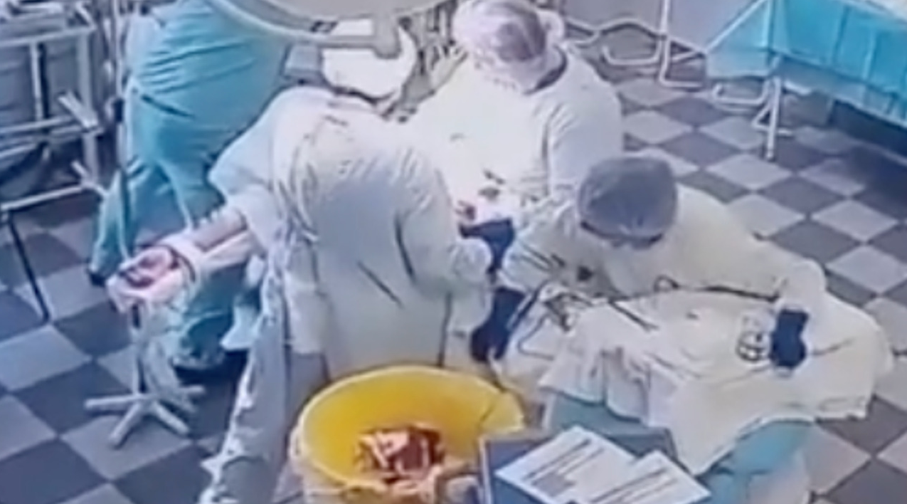 शल्यक्रिया कक्ष बेस्सरी हल्लिरहँदा चिकित्सकहरूले बिरामी, सर्जिकल उपकरण र मोनिटरहरूलाई समातिरहेको भिडियोमा देखिन्छ ।