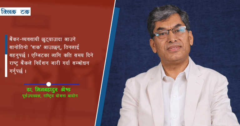 उक्त व्यवस्था आवश्यक हो कि होइन ? बैंकर र व्यवसायी किन छुट्याउनुपर्छ भन्ने महसुस किन भयो ? यसले बैंकिङ क्षेत्रलाई थप व्यवस्थित बनाउन सक्छ ? भन्ने विषयमा केन्द्रित रहेर नेपाल राष्ट्र बैंकका पूर्वकार्यकारी निर्देशक तथा राष्ट्रिय योजना आयोगका पूर्वउपाध्यक्ष अर्थविद् डा. मिनबहादुर श्रेष्ठसँग कुराकानी गरेका छौं । प्रस्तुत छ, डा. श्रेष्ठसँग क्लिकमान्डुका लागि विजय पराजुलीले गरेको ‘क्लिक-टक’ ।