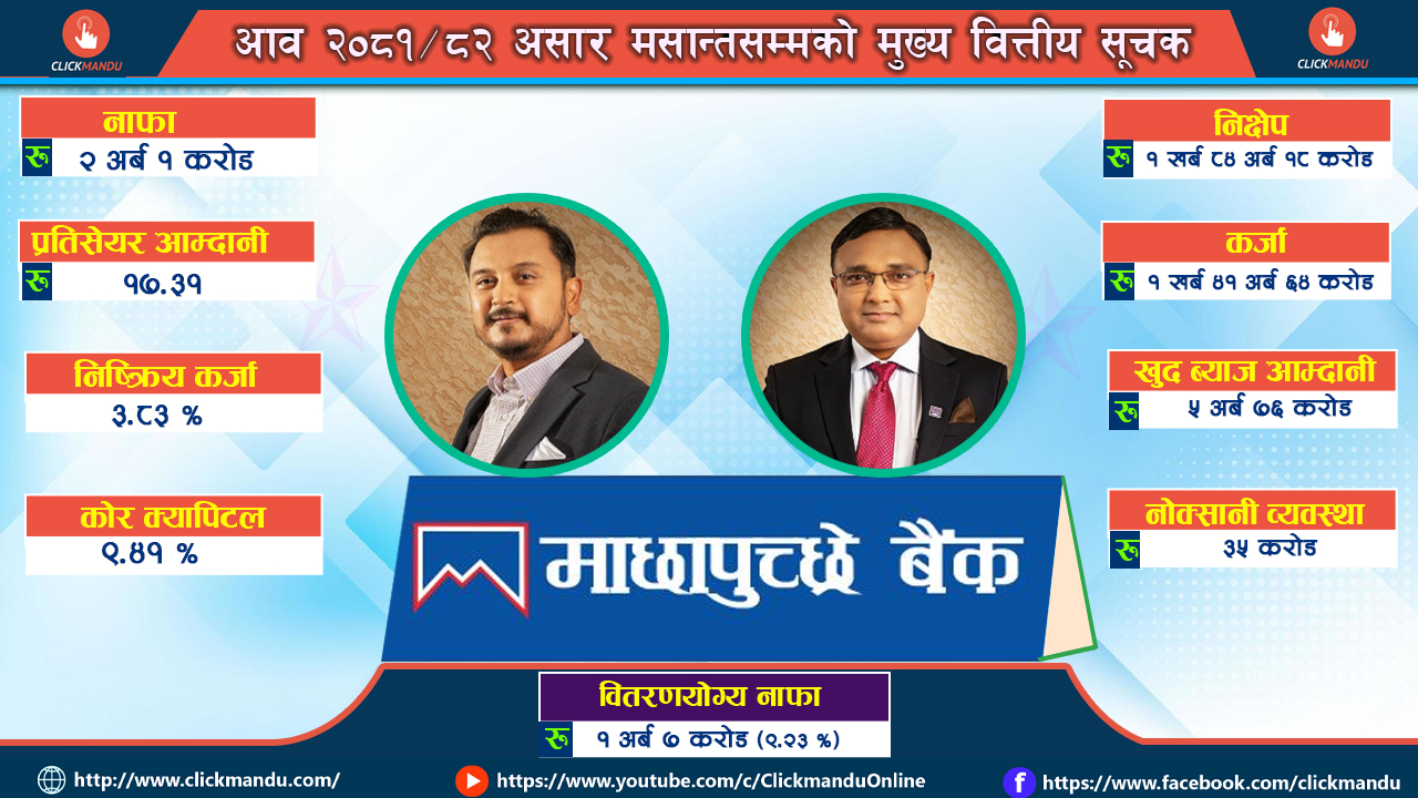 काठमाडौं । व्यवसाय विस्तारसँगै आम्दानीमा भएको वृद्धि र सम्भावित कर्जा नोक्सानी व्यवस्था घट्दा माछापुच्छ्रे बैंकको नाफा उल्ल्लेख्य बढेको छ । बैंकले गत आर्थिक वर्ष २०८१/८२ मा २ अर्ब १ करोड १५ लाख रुपैयाँ नाफा आर्जन गरेको हो जुन अघिल्लो आर्थिक वर्ष २०८०/८१ को १ अर्ब ४ करोड ५२ लाख भन्दा ९२.४५ प्रतिशतले बढेको हो ।