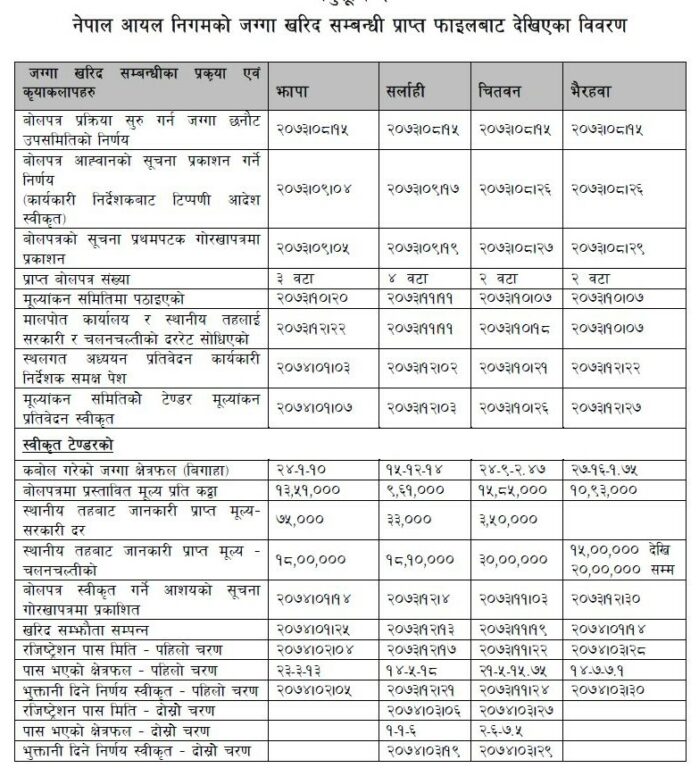‘मन्त्रालयको उच्च नेतृत्वदायी जिम्मेवारीमा रहेका पदाधिकारी, आयल निगम सञ्चालक समितिका अध्यक्षसहित जिम्मेवार सदस्य पदाधिकारी, खरिद प्रक्रियामा संलग्न निगमका सम्पूर्ण जिम्मेवार अधिकारी, टेण्डरदाता, गाबिस सचिव तथा वडा सचिव, मालपोत कार्यालयका कर्मचारी, स्थानीय बिचौलिया सबै बोलपत्रका माध्यमबाट निगमले जग्गा खरिद गर्दा हुन गएको आर्थिक अपव्यय, अपचलन र अनियमिततामा आ आफ्नो स्थानमा जिम्मेवार देखिन्छन्,’ प्रतिवेदनमा भनिएको छ,‘सबैको मिलेमतो वा उदासिनतामा बोलपत्रका माध्यमबाट निगमलाई अत्यधिक व्ययभार पारेको र सर्वसाधारण उपभोक्ताले तिरेको रकमको अपव्यय भएको देखिन आउँछ । सञ्चालक समिति र निगमका जिम्मेवार अधिकारीको जिम्मेवारी र उत्तरदायी खोजी गरी कानूनी कारबाही गर्नुपर्दछ ।’