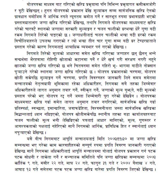प्रतिवेदनमा भनिएको छ,‘निगमले बोलपत्रको माध्यमबाट खरिद गरेको चारवटै स्थानको जग्गामा सरकारी मूल्याँकन र चलनचल्तीको दरभन्दा धेरै गुणा बढी रकम निगमले तिरेको पाइएको, जग्गाधनीलाई चलनचल्तीभन्दा बढी दरको रकम बिचौलियाहरुले उपलब्ध गराएको र त्योभन्दा तीन/चार गुणासम्म बढी दर टेण्डरदाताले प्रस्ताव गरेको कारण निगमलाई अत्यधिक व्ययभार परेको छ । सञ्चालक समिति जग्गा खरिद सम्बन्धमा पूर्ण जानकार रहेको छ भन्न सकिन्छ । मन्त्रालय र नेतृत्वदायी भूमिकामा रहने पदाधिकारी बोलपत्रका माध्यमबाट जग्गा खरिद भएको विषयमा जानकार रहेको बुझिन्छ ।’