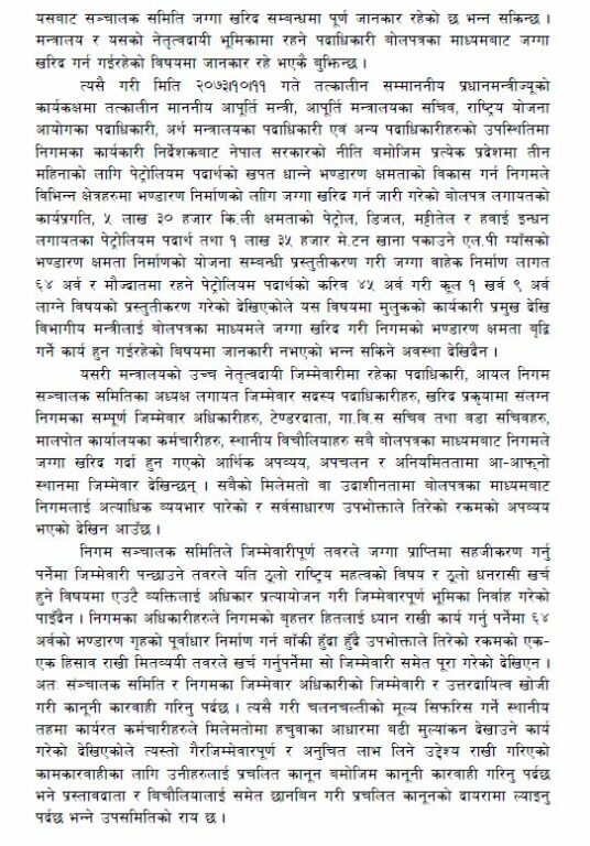 जग्गा खरिद प्रकरणमा जति बदमासी तत्कालीन कार्यकारी निर्देशक खड्काको थियो त्यतिकै फट्याई सञ्चालक समितिको पनि थियो । यो बाहेक निगमले ९० दिनका लागि पेट्रोलिमक पदार्थ मौज्दातका लागि विभिन्न स्थानमा भण्डारण गृह निर्माणका लागि जग्गा खरिद गरिरहेको विषयमा तत्कालीन प्रधानमन्त्री र विभागीय मन्त्रीसम्मले पटक पटक ब्रिफिङसहित जानकारी लिएका थिए ।
