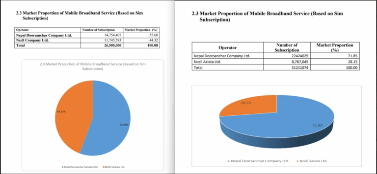 ग्राहकले प्रयोग गरिरहेका सिमकार्डका आधारमा मापन भएको यस्तो बजार हिस्सा पछिल्लो एक वर्षमा टेलिकमको खुम्चदा साेही अनुपातमा एनसेलको माेबाइल ब्रोडब्यण्डका प्रयोगकर्ता भने बढेको देखिएको छ ।