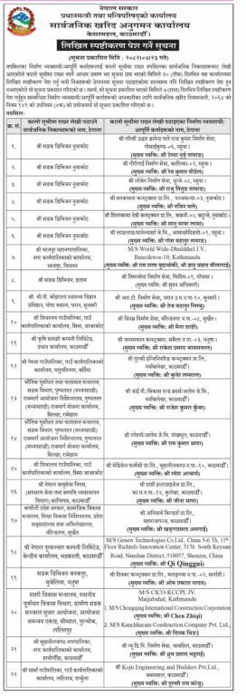 यस्तै तेजबहादुर लिम्बु मुख्य व्यक्ति भएको आरटी निर्माण सेवा सुनसरी, मैना शाही मुख्य व्यक्ति भएको विनम्र निर्माण सेवा सुर्खेत, राकेशप्रसाद जायसवाल मुख्य व्यक्ति भएको जायसवाल कन्स्ट्रक्सन धनुषा, कुवेर लम्साल मुख्य व्यक्ति भएको तुल्सी इन्जिनियरिङ कन्स्ट्रक्सन प्रालि काठमाडौं, राजेश कुमार कुँवर मुख्य व्यक्ति भएको वाई पी /विकास एण्ड ब्रदर्श/आत्रेय जेभी काठमाडौं, रामकुमार थापा मुख्य व्यक्ति भएको लोहनी/आत्रेय जेभी शंखमुल काठमाडौं पनि कालोसूचीमा राख्न सिफारिस भएकाले सात दिने स्पष्टीकरण मागिएको छ ।