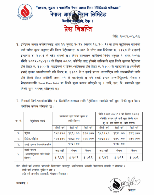 हाल काठमाडौंभन्दा पोखरामा १८१ डलर र भैरहवामा १९१ डलर प्रतिकिलो लिटरले अन्तर्राष्ट्रिय तर्फको हवाई उडानमा इन्धन सस्तो छ । अहिले काठमाडौंमा आयल निगमले ९७३ डलर प्रतिकिलोलिटर अन्तर्राष्ट्रिय हवाई इन्धन बिक्री गर्छ भने यस्तो मूल्य पोखरामा ७९२ डलर र भैरहवामा ७७६ डलर प्रतिकिलोलिटरको छ ।
