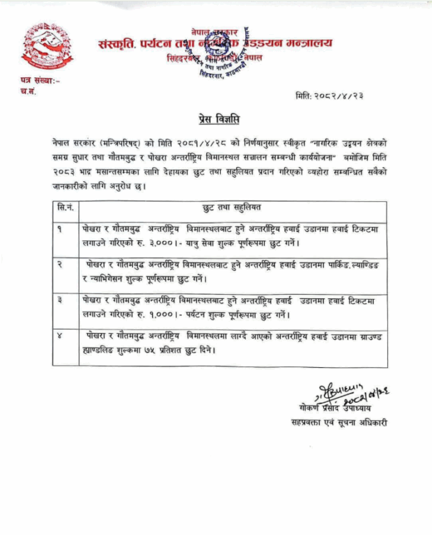 सरकारले गत वर्ष साउन २८ मै ‘नागरिक उड्डयन क्षेत्रको समग्र सुधार तथा गौतमबुद्ध र पोखरा अन्तर्राष्ट्रिय विमानस्थल सञ्चालन सम्बन्धी कार्ययोजना’ अनुसार छुट दिएको छ । यी दुई विमानस्थलको अन्तर्राष्ट्रिय उडानका लागि हवाई टिकटमा लाग्ने प्रतियात्रु ३ हजार रुपैयाँको यात्रु सेवा शुल्कमा छुट छ ।