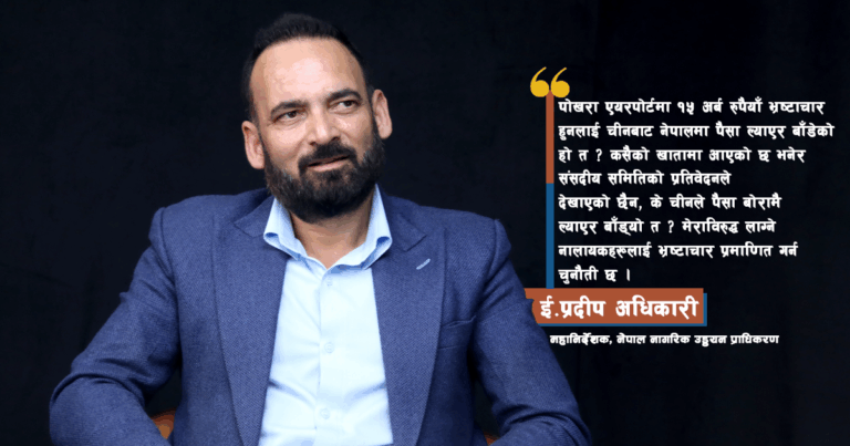 हवाई क्षेत्रको नियामक नेपाल नेपाल नागरिक उड्डयन प्राधिकरणलाई महानिर्देशक इन्जिनियर प्रदीप अधिकारीले नेतृत्व गरेपछि चर्चा र विवाद दुवै जारी छ । उड्डयनको क्षेत्रमा भएका निर्णय सेवाप्रदायकले नरुचाउने र सेवाप्रदायकलाई कानूनी दायरामा बसेर नियमन गर्न लगाउने काम प्राधिकरणले गर्ने गरेको छ । तर यसक्रममा भएको टसलदेखि पोखरा विमानस्थल निर्माणमा अर्बौंको भ्रष्टाचार भएको आरोपले चर्चाको शिखरमा पुगेका … Continue reading मेराविरुद्ध लाग्ने नालायकहरूलाई पोखरा एयरपोर्टको भ्रष्टाचार प्रमाणित गर्न चुनौती दिन्छु: प्रदीप अधिकारी