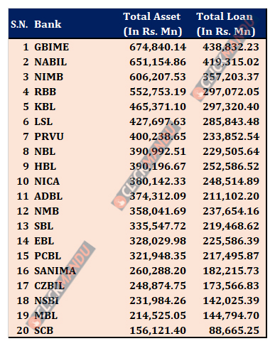 गत चैतको वासलताको आधारमा कर्जा लगानीमा १० ठूला बैंकहरू ग्लोबल आईएमई, नबिल, नेपाल इन्भेष्टमेन्ट मेगा, राष्ट्रिय वाणिज्य, कुमारी, लक्ष्मी सन्राइज, प्रभु, हिमालयन, एनएमबि र एनआईसी एशिया बैंक हुन् ।