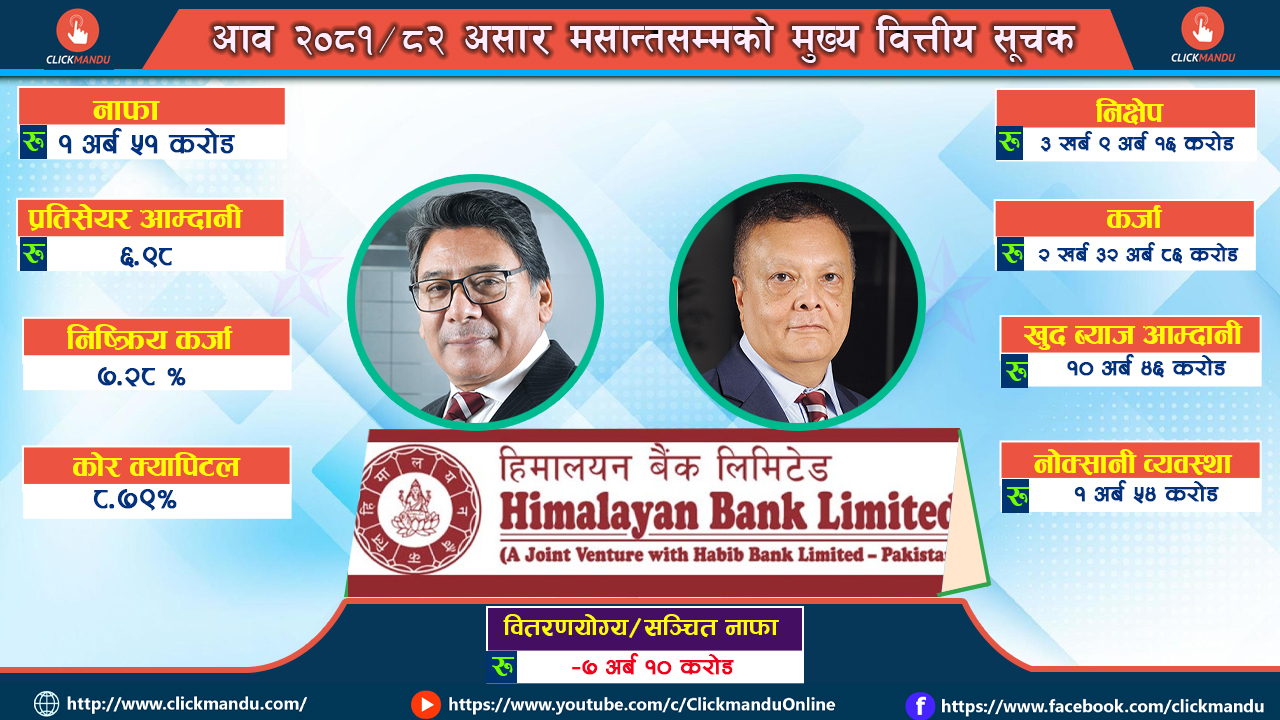 काठमाडौं । हिमालयन बैंकले गत आर्थिक वर्ष २०८१/८२ मा १ अर्ब ५१ करोड २५ लाख रुपैयाँ नाफा कमाएको छ । बैंकले अघिल्लो आर्थिक वर्षको तुलनामा खुद नाफा २२.१५ प्रतिशतले बढाएको हो ।