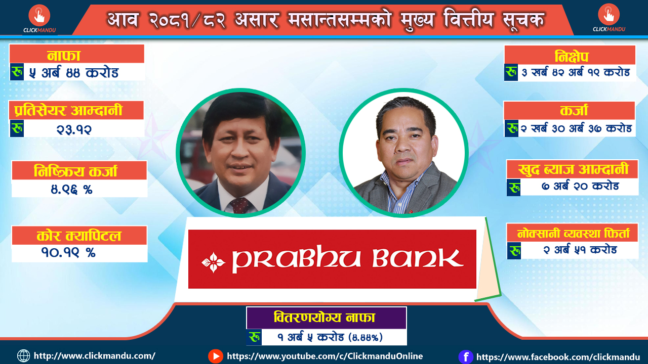 काठमाडौं । प्रभु बैंकले गत आर्थिक वर्षमा ५ अर्ब ४४ करोड २७ लाख रुपैयाँ खुद नाफा गरेको छ । बैंकले अघिल्लो आर्थिक वर्षको तुलनामा खुद नाफा साढे १० गुणाले बढाएको हो ।